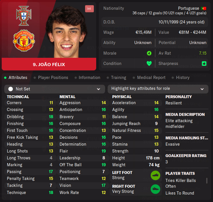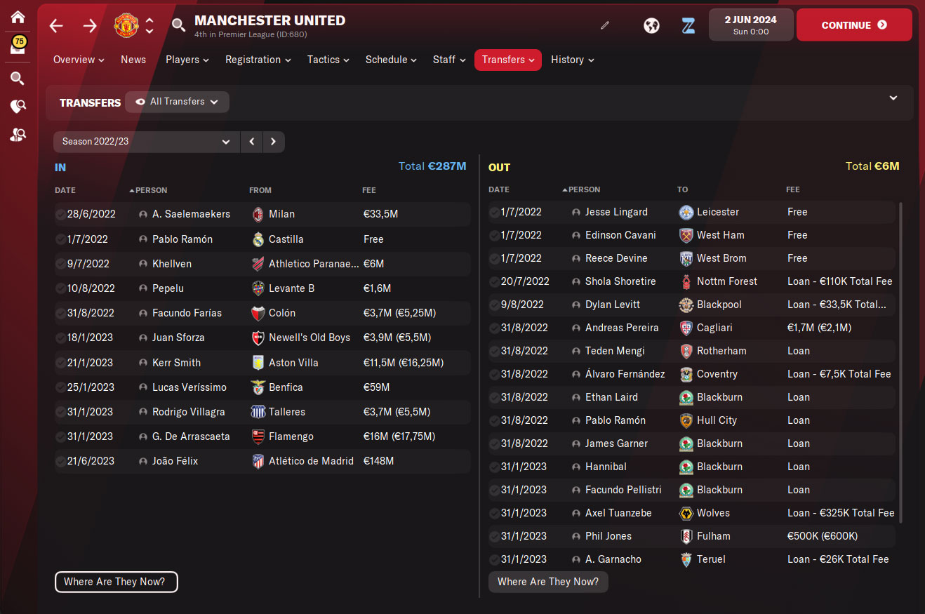 Nakon neuspješne prve sezone, Erik ten Hag je krenuo u pojačavanje ekipe. Prvo pojačanje (nije na screenshotu iznad jer je doveden još tijekom šestog mjeseca) je kapitalac – Joao Felix. Atletico Madrid je za njega dobio €148m što je veća cifra od one koju su na Old Traffordu potrošili cijelo prošlo ljeto. Nakon Portugalca došlo je tog ljeta još sedam igrača: Mateus Uribe, Ilias Akhomach, Alan Velasco, Douglas Santos, Georginio Wijnaldum, Aleksandar Popović i Jean-Clair Todibo. Vrijedi primijetiti da je ovog ljeta doveden veći broj igrača koji su odmah konkurirali za mjesto u prvoj ekipi. Na zimu su ekipu dodatno pojačali Gabriel Barbosa “Gabigol” te newgen Ümit Topçu.