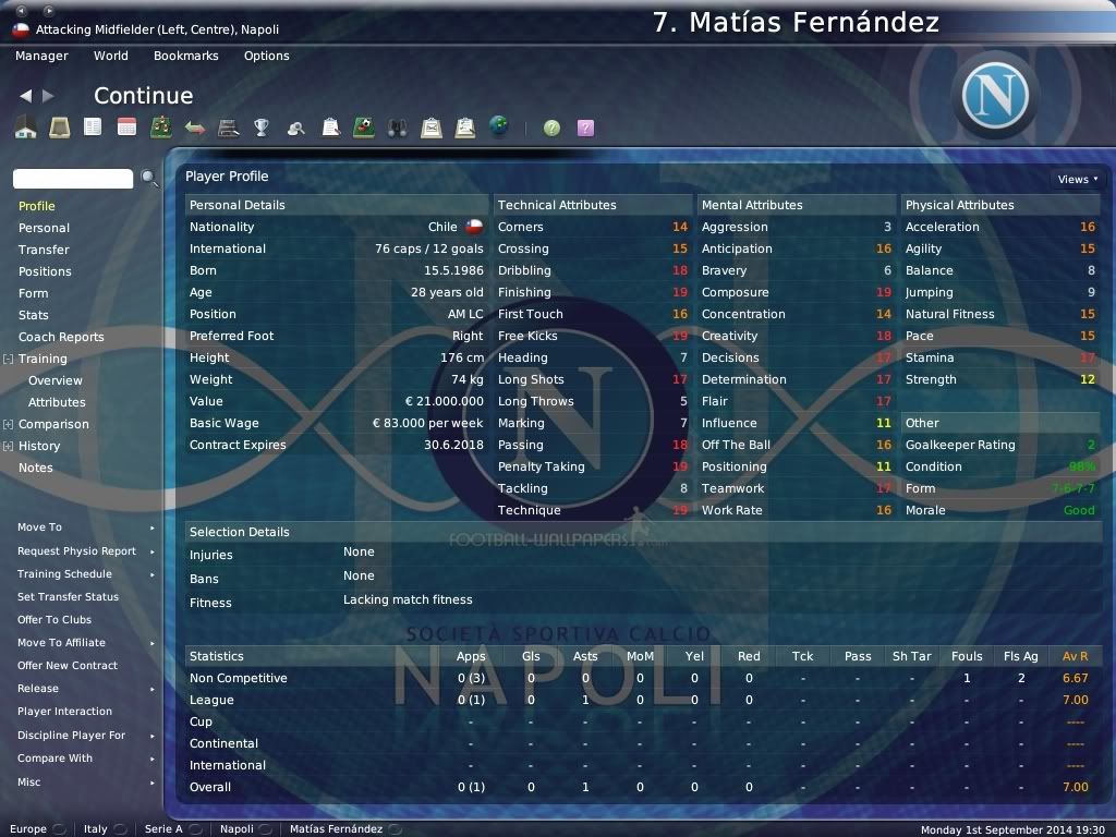 Matias Fernandez â€" igracina, svi ga znate, dosa mi je da malo pojaca konkurenciju u sredini terena, ali i da briljira. Sve o njemu se zna, netreba posebno naglasavat nista, jedino ga godine malo guse, jer mojon politikon 28 godina je vec za izmak snaga, al jos on moze, jos nije pa, jos je igracina.
