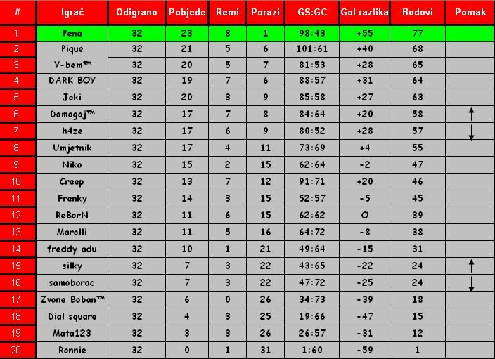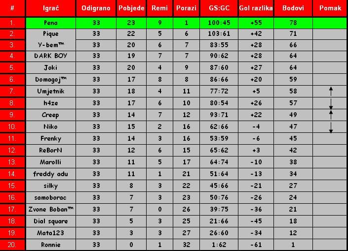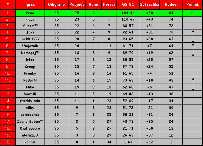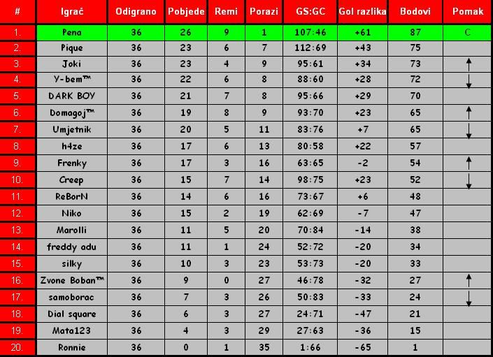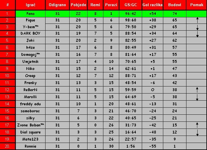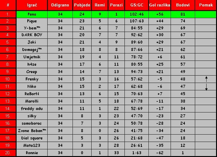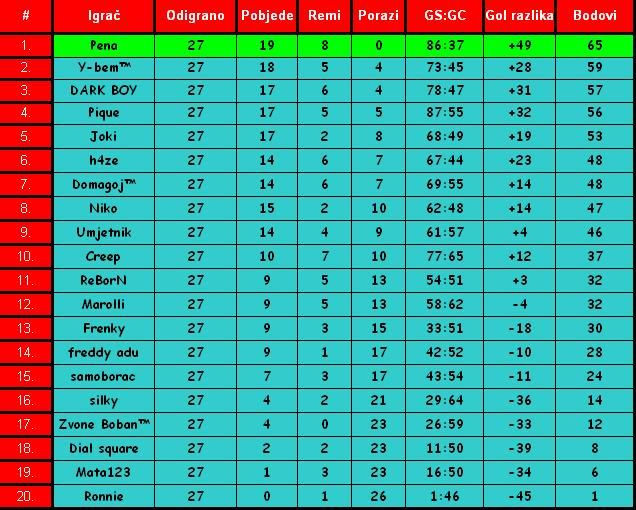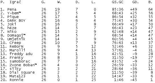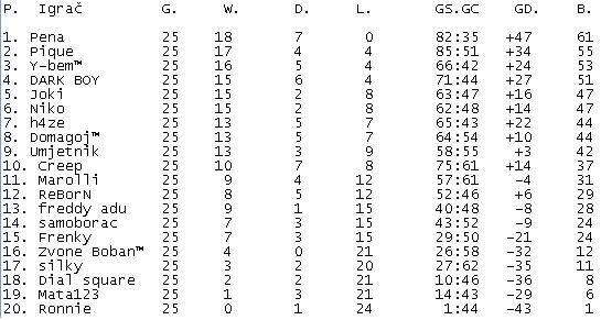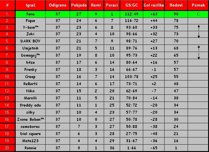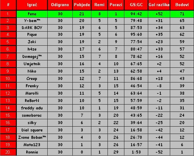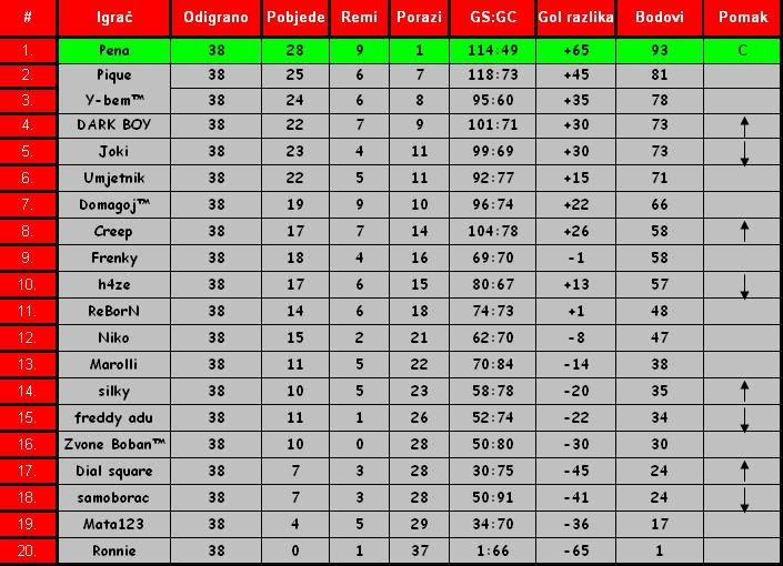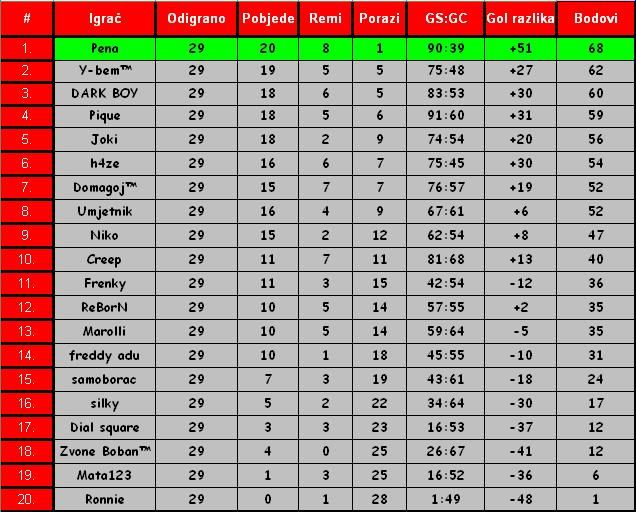 C-osigurao naslov prvakaÄŒestitke pobjedniku i hvala svima na sujelovanju. Bila je ovo duga i napeta sezona u kojoj su petorica igraÄa se izmjenjivala na vrhu,ali kad je Pena jednom zasjeo na vrh tu poziciju viÅ¡e nije ispuÅ¡tao. Oboreni su i mnogi rekordi Å¡to ćete uskoro moći vidjeti u HoF-u. Prva trojica u poretku biti će nagraÄ‘eni s karmom.