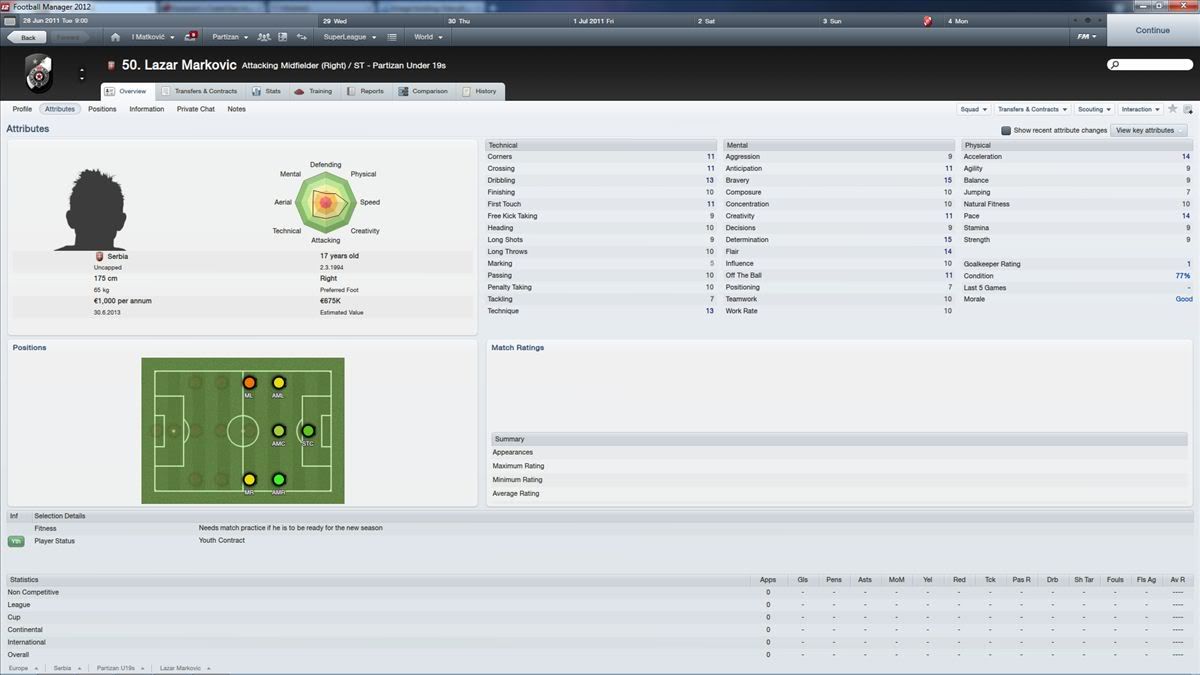 A za Markovića sam morao new game započinjat. Report kaže da može postati leading SL wigner. Odlično je napravljen na prvi pogled. Inače, vaša liga je općenito dosta jaka čini mi se, ali youth team Partizana je prepun talenata.