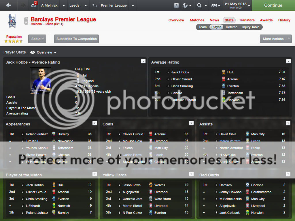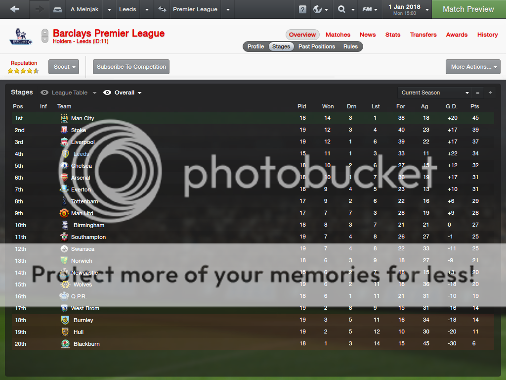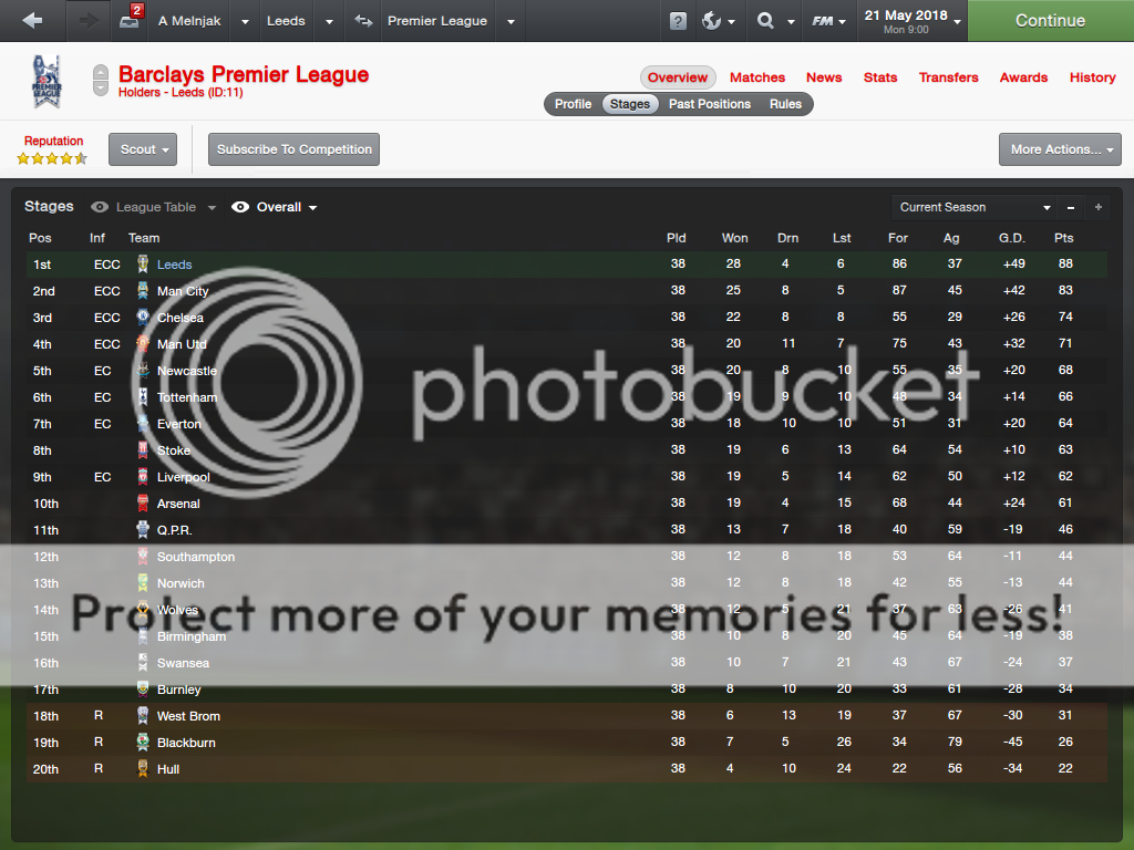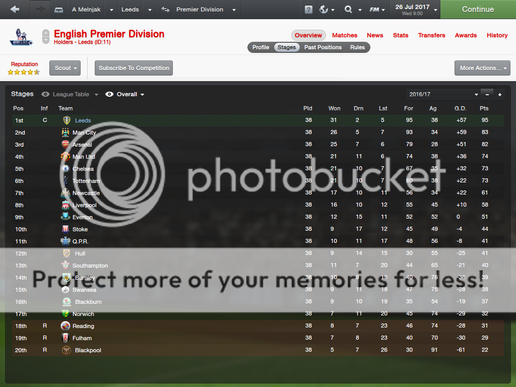 Neću duljiti jer mi je prst u longeti pa jedva piÅ¡em. Evo nakon dosta vremena upalio sam ponovno sejv s omiljenim Leedsom i zavrÅ¡io ostatak sezone. Bila je ovo moja 6. sezona u Engleskoj, a 5. u najelitnijem druÅ¡tvu. Za sezonu mogu reći da je uspjeÅ¡na. Neki igraÄi su se dokazali i ozbiljno nametnuli, dok neki jednostavno ne mogu pratiti ritam velikog Engleskog diva. Drugi dio polusezone, takoÄ‘er sam koristio za uigravanje dva nova sustava. Koja su to, neću Vam joÅ¡ otkrivati, ali siguran sam da će se vidjeti na rezultatima u sljedećoj sezoni! MeÄ‘utim krenimo s ostvarenim rezultatima ove sezone.