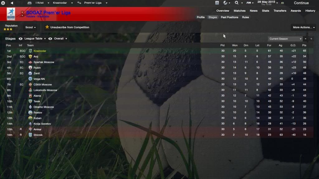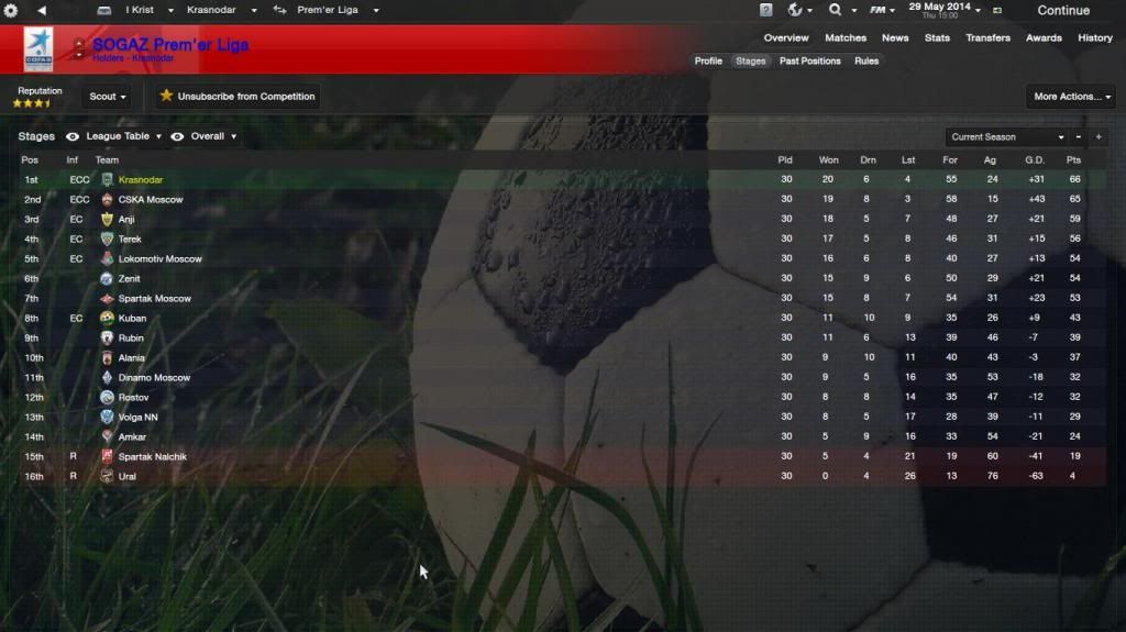 ali od tada pa do 30. kola zaredane su 4 pobjede dok CSKA kiksa i u zadnje kolo ulaze s bodon prednosti s tin da idu u goste Anzhiju, a ja doma docekujen Rostov