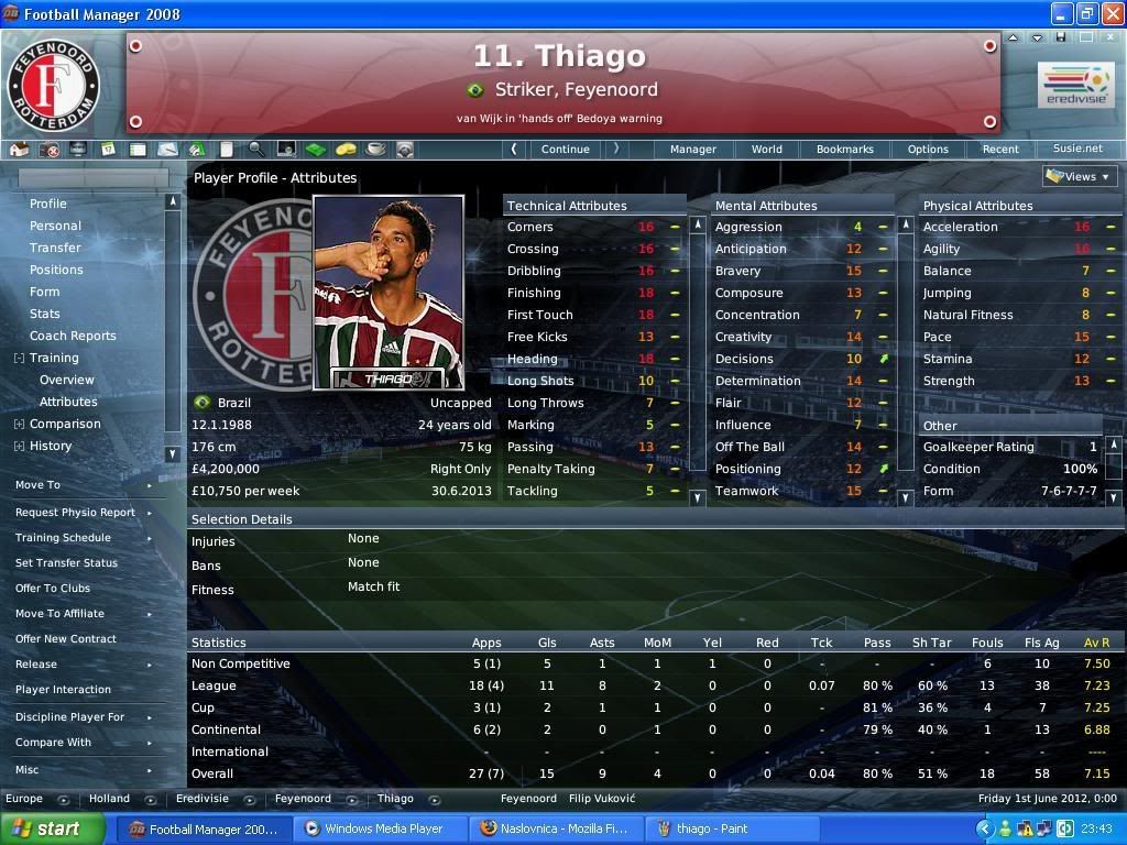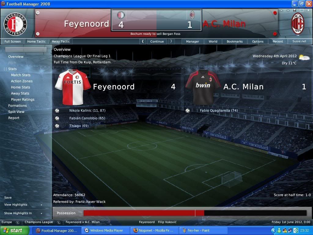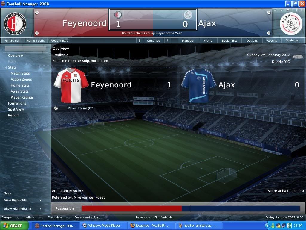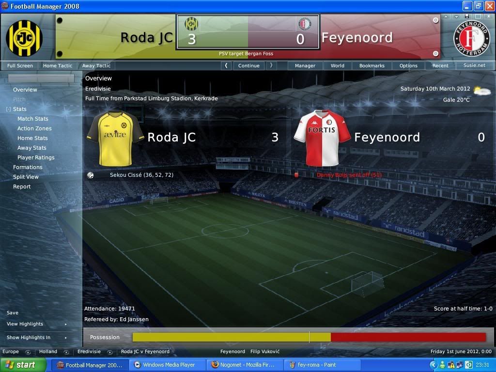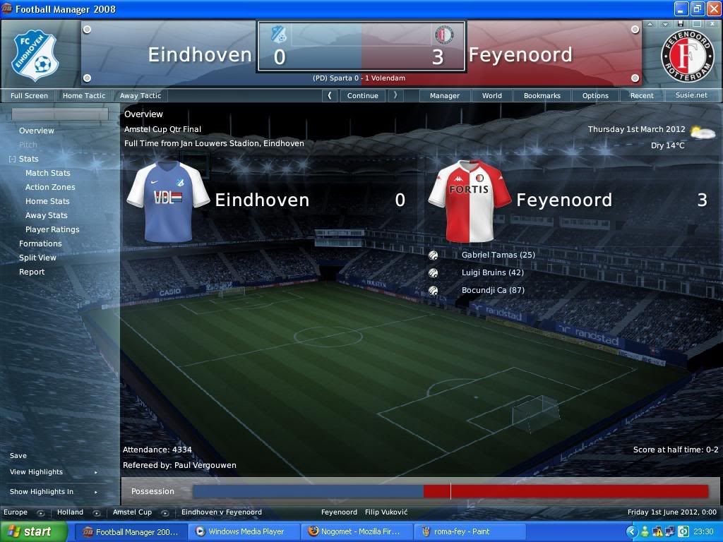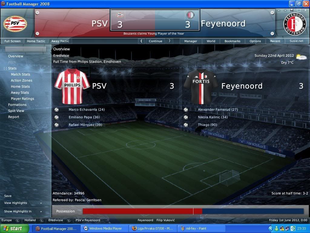 PSV - Feyenoord 3:3Iako je PSV jako loš ove sezone,nisam se nadao da ću lagano doći do 3 boda,ako ću do njih uopće doći.Odlična utakmica se igrala na Phillips stadionu.Domaći su poveli u 24. minuti.No deset minuta kasnije bilo je već 1-2 za mene(Farnerud 27. i Kalinić 34.).Al jbg prednost nije ostala do kraja prvog poluvremene,te PSV u razmaku od 3 minute postiže 2 pogotka i na odmor PSV ide s prednošću od 3-2.I kad se već činilo da ću zaključiti sezonu porazom,Thiago postiže gol u sučevoj nadoknadi za konačnih 3-3.