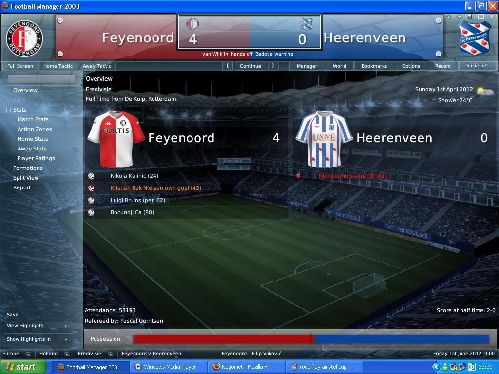 Feyenoord - Heerenveen 4:0Rutinska pobjeda nad Heerenveenom.Ovu pobjedu sam stavio ponajviše radi toga da ne bude premalo ss-ova prvenstvenih utakmica.