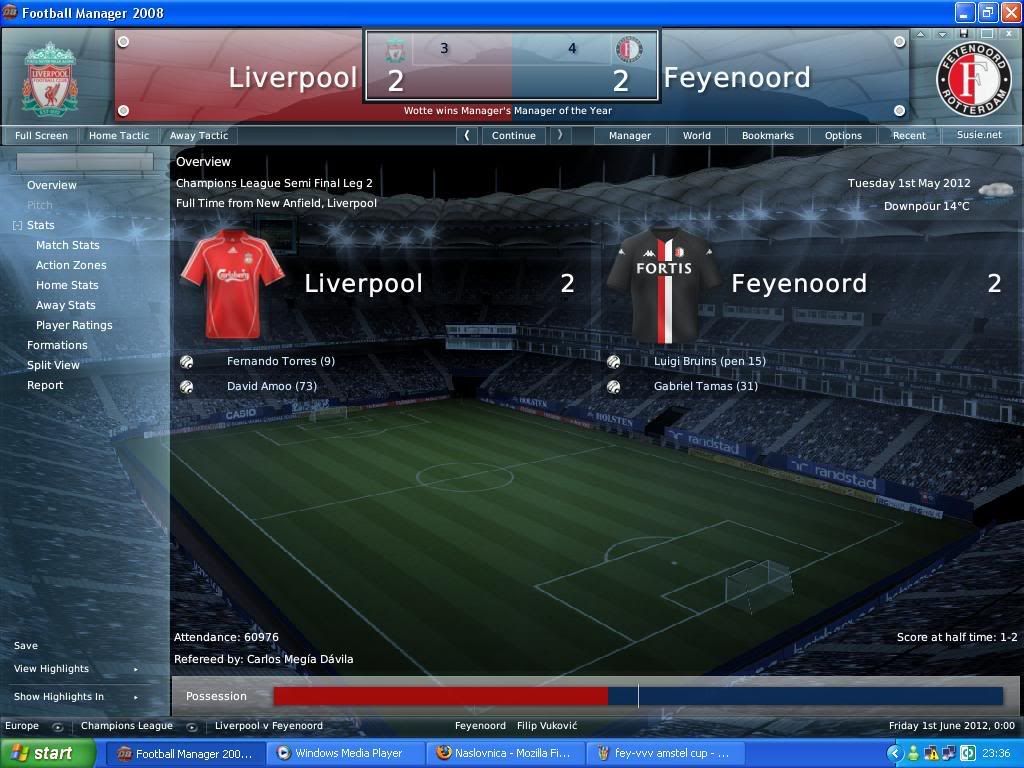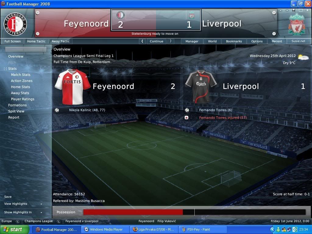 Liverpool - Feyenoord 2:2Nadao sam se da Torres neće igrati,no ipak je bio u prvih 11,iako se tek oporavio.I takav tek oporavljen je vrlo opasan.Liverpool je i došao u vodstvo njegovim golom,ali nedugo zatim Bruins izjednačuje iz penala,da bi do kraja poluvremena Tamas zabio za 1-2.Do kraja Liverpool je uspio samo izjednačiti,a moja ekipa je prošla u svoje 2. finale LP-a otkako sam ja na klupi.U finalu sam čekao pobjednika iz susreta Barca-Inter...