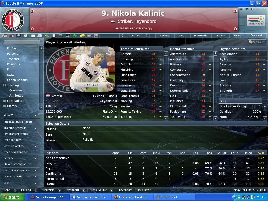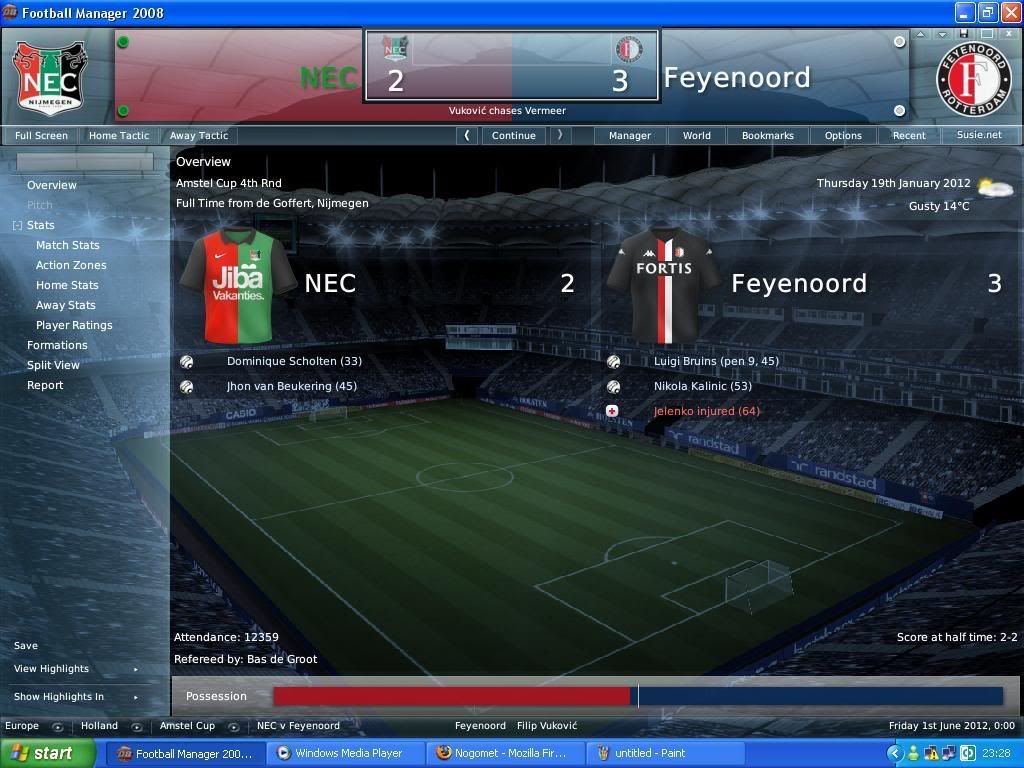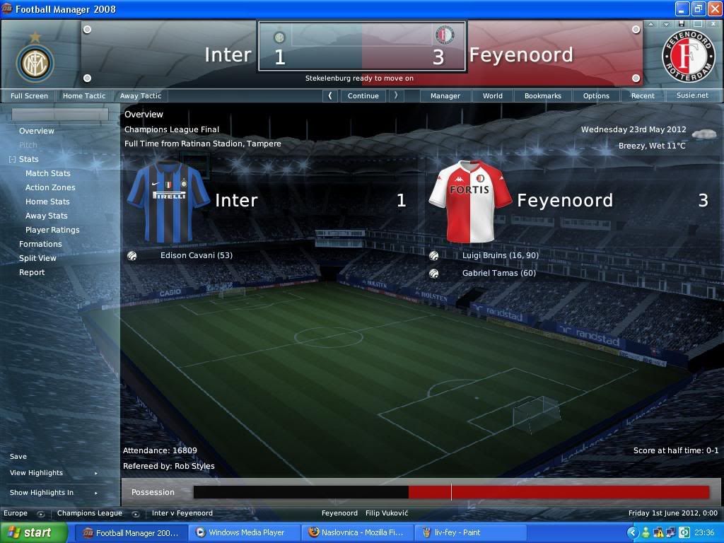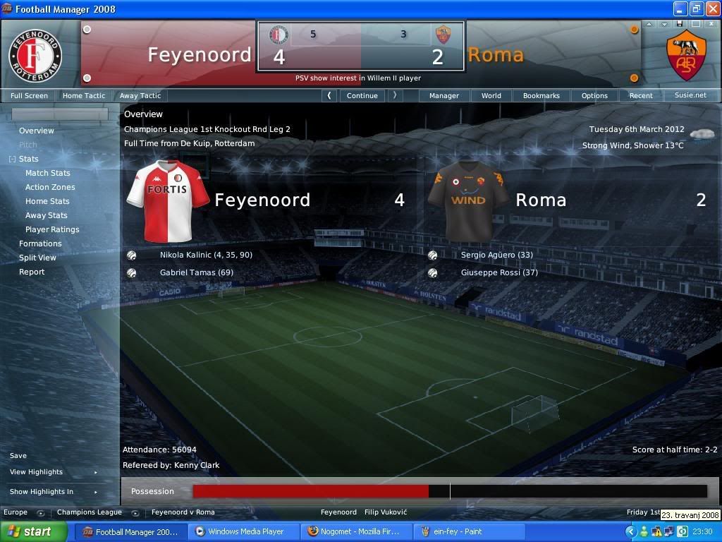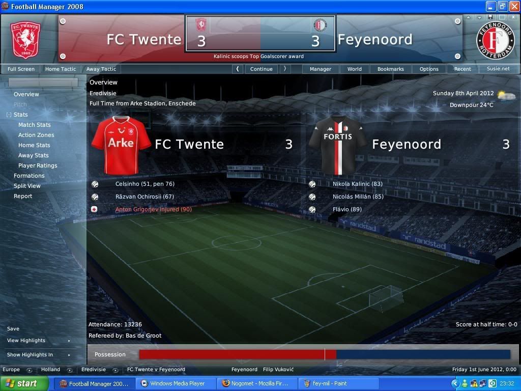 Twente - Feyenoord 3:3E ovo je bila sjajna utakmica,barem drugo poluvrijeme.Na odmor se otišlo s rezultatom 0:0,a kad je u 76. bilo već 3-0 za Twente,mislio sam da mi se bliži još jedan poraz i to opet 3-0.No moji igrači su se nevjerojatno vratili.Prvo Kalinić smanjuje u 83.,a Millan samo 2 minute kasnije dovodi utakmicu u neizvjesnost pogotkom za 3-2.I onda u 89. Flavio postiže izjednačujući pogodak.Bio sam sretan i s remijem,jer bio sam na pragu poraza,a onda sam u samo 6 minuta došao do boda.