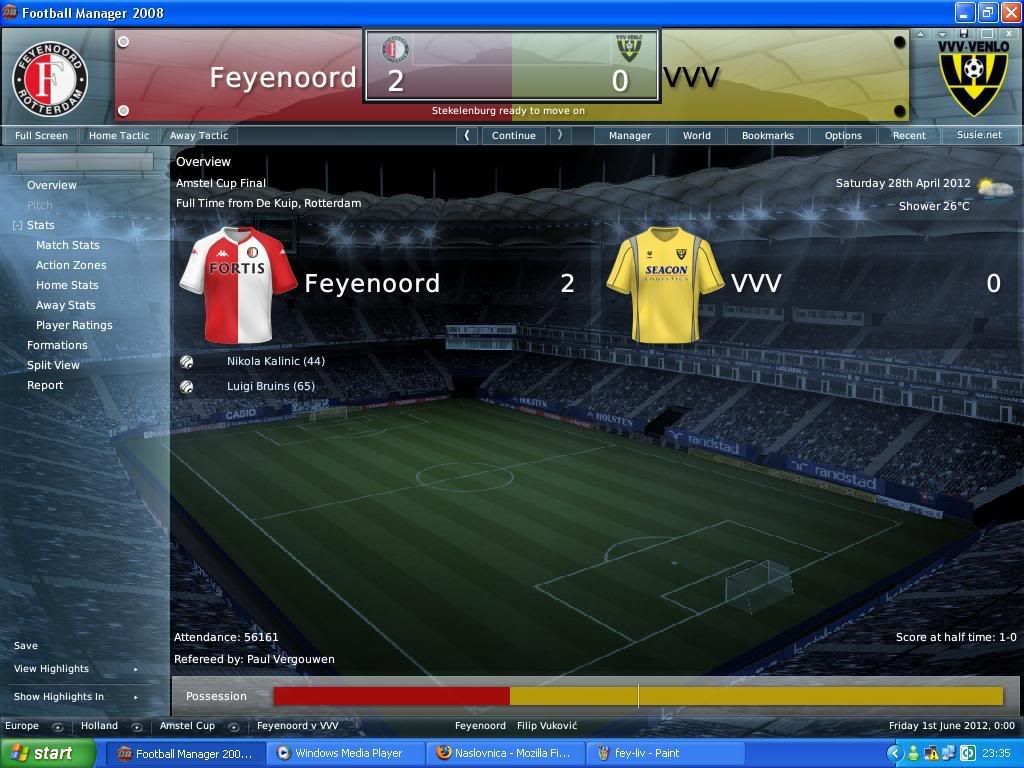 finaleFeyenoord - VVV 2:0VVV je napravio golemi uspjeh ulaskom u finale.Zato će i igrati Kup UEFA iduće sezone.No moja momčad ih je bez većih problema pobjedila i obranila Amstel Cup.