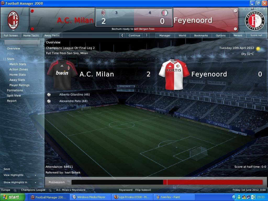 Milan - Feyenoord 2:0Pirova pobjeda Milana.Nisu bili previše bolji od mene,ali su zasluženo pobjedili,no nisu zaslužili prolaz.Slijedio je Liverpool...