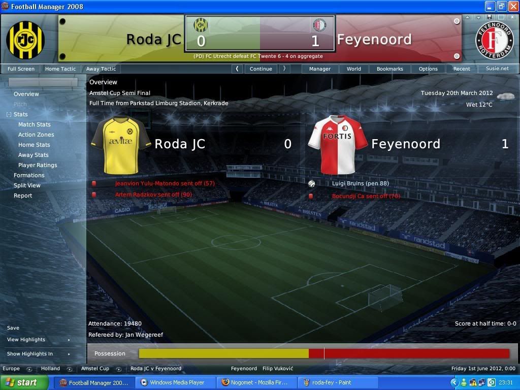 polufinaleRoda - Feyenoord 0:1U polufinalu me snašla Roda.Kup utakmica protiv njih se igrala nedugo nakon one prvenstvene(3-0 za rodu) i imao sam tremu uoči gostovanja.Nadao sam da se neće ponoviti ta prvenstvena utakmica.I srećom nije se ponovila,bilo je 0-1 za mene,al utakmica je bila gruba.Sudac je podijelio 3 crvena kartona.Dva njima, a meni jedan