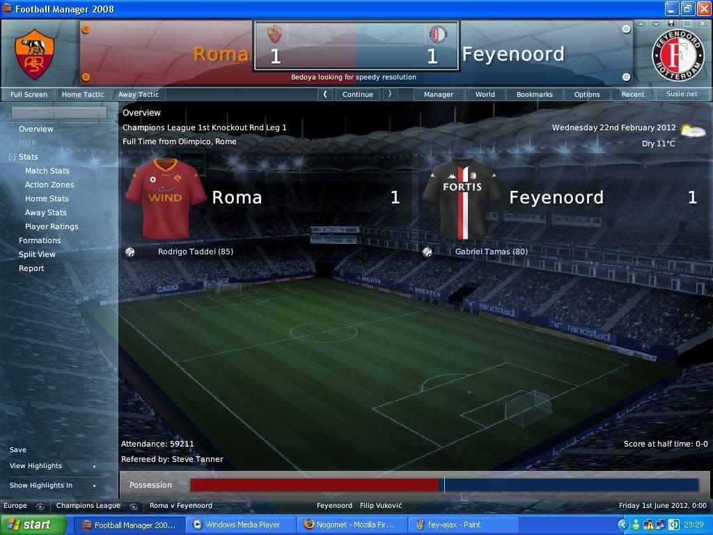 1/8 finalaRoma - Feyenoord 1:1Znajući kakve Roma ima igrače(M.Fernandez,G.Rossi,Aguero...),s tremom sam ušao u dvoboj s Romom.Mislio sam de će me razvaliti,a zapravo ispalo je više nego dobro.Roma je bila bolja,no Tamas je doveo moju momčad u vodstvo u 80. minuti,ali 5 minuta kasnije Taddei izjednačuje,no i 1-1 je odličan rezultat za uzvrat.