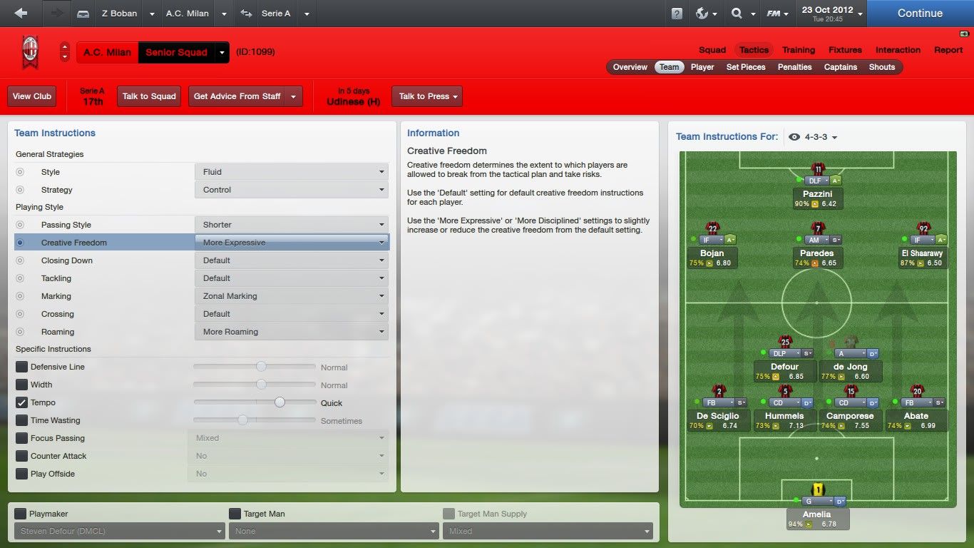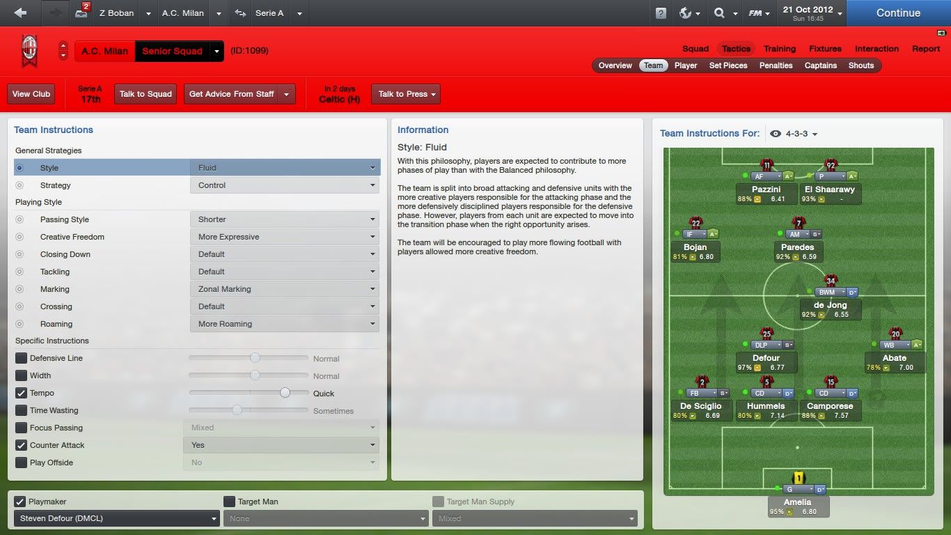 I za ofanzivnog veznog si izabrao poprilično defanzivnu opciju. Kako imaš playmakera nazad i uz to imaš po igrača u sve tri vezne linije ofanzivni vezni može biti sa attack rolom, ne AP, prije AM ili IF.